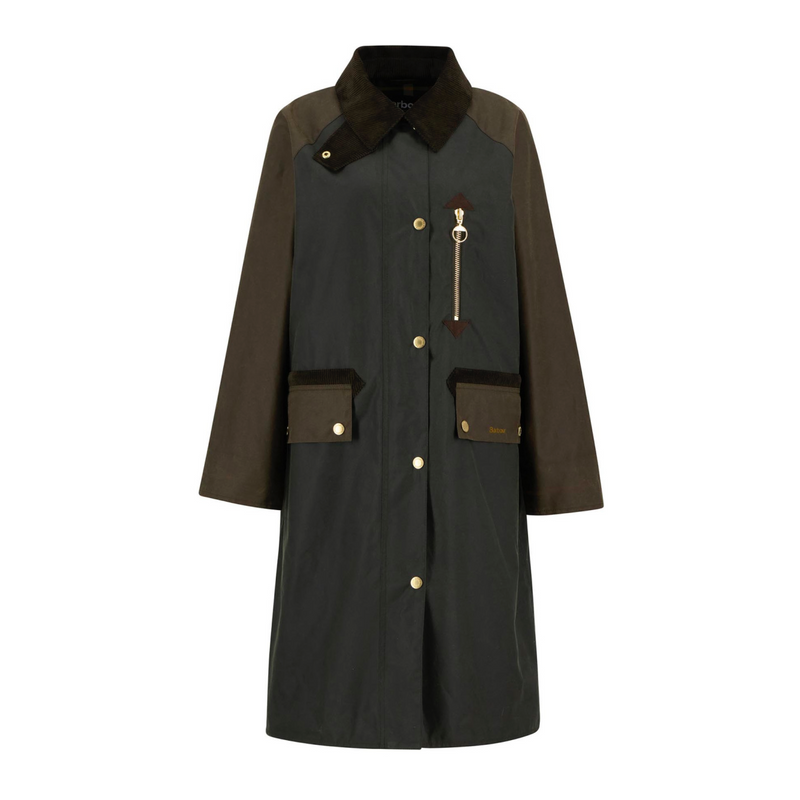 Una giacca in cotone cerato che combina heritage e funzionalità per affrontare le condizioni meteo con eleganza. Il modello ha uno stile ispirato all’archivio: colletto in velluto a coste, fodera interna a motivo tartan, e uno spacco posteriore profondo che assicura libertà nei movimenti. Il davanti è caratterizzato da una patta con bottoni a pressione, dietro cui si cela una zip robusta per una chiusura sicura. Le tasche anteriori a filetto sono pratiche e discrete, mentre una tasca con zip sul petto garantisce un vano extra per piccoli oggetti. Il design leggermente svasato ne valorizza la silhouette senza stringere. Tessuto cerato idrorepellente, finiture curate e grande attenzione ai dettagli ne fanno un capo versatile e durevole, ideale per completare look raffinati con un tocco outdoor sofisticato.