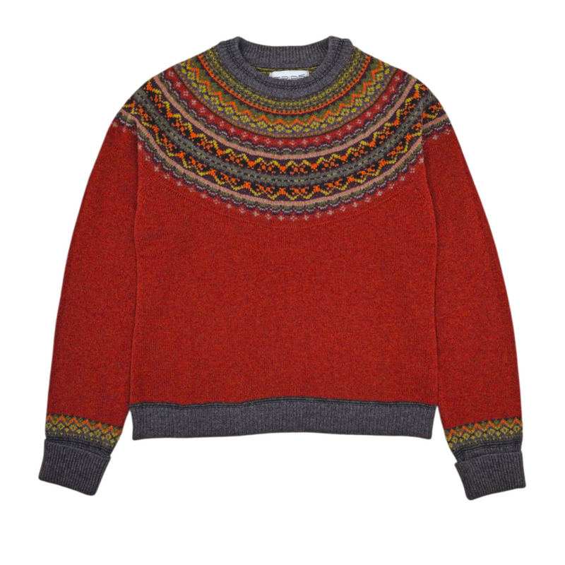Presenta un classico motivo a yoke Fair Isle reinterpretato con sensibilità moderna, arricchito da dettagli tweed sui bordi dei orli e dei polsini lunghi “turn-down” che avvolgono con calore.
