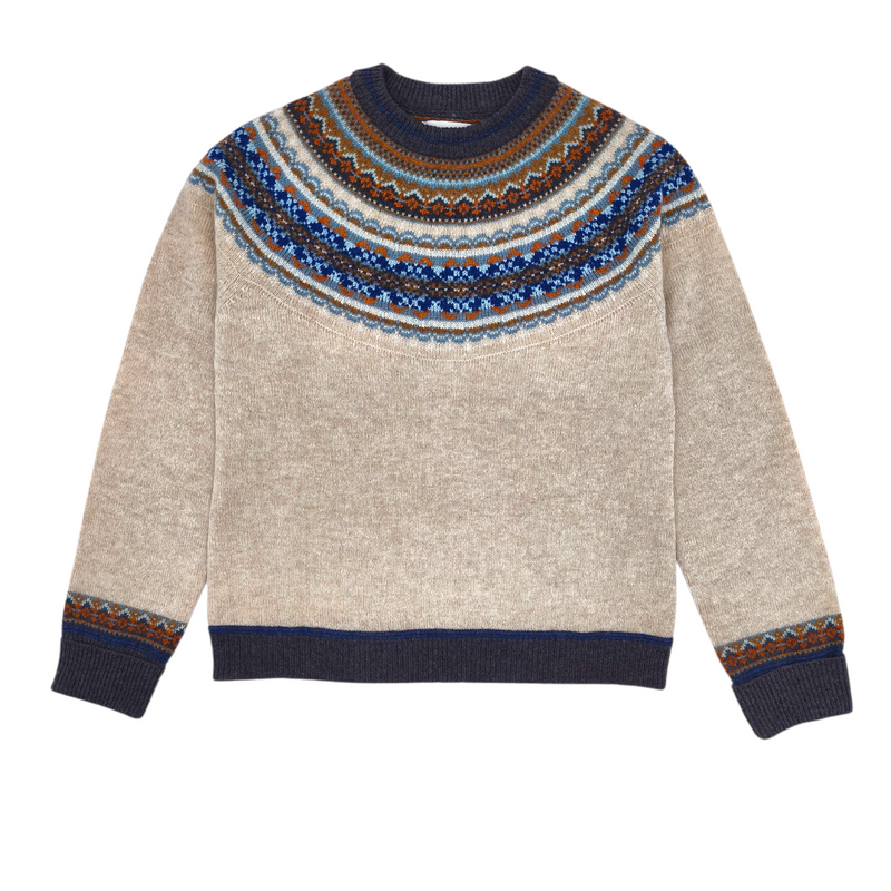 Presenta un classico motivo a yoke Fair Isle reinterpretato con sensibilità moderna, arricchito da dettagli tweed sui bordi dei orli e dei polsini lunghi “turn-down” che avvolgono con calore.