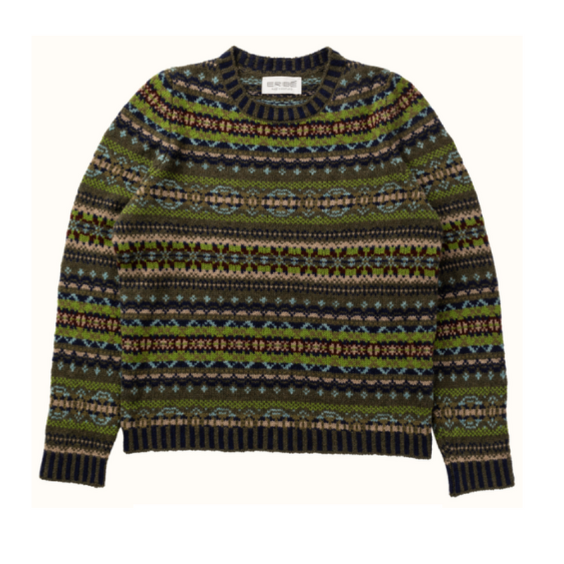 Il modello presenta una struttura a fantasia Fair Isle, impreziosita da bordi rigati su orlo e polsini che creano un contrasto armonioso e un’estetica classica reinterpretata in chiave moderna.