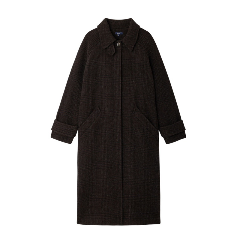 Questo cappotto lungo incarna l’eleganza classica reinterpretata con gusto contemporaneo. Realizzato in 100 % lana vergine a motivo check, presenta una trama intensa e raffinata che conferisce texture e carattere visivo. Il taglio è dritto e cade fino a metà polpaccio, offrendo una silhouette slanciata e versatile. L’apertura frontale è dotata di bottoniera nascosta, per un effetto pulito, mentre le tasche a filetto ai fianchi aggiungono praticità discreta. Il modello è completato da spacco posteriore, che facilita il movimento, e maniche raglan con polsini dotati di patta con bottone per un tocco sartoriale. La fodera interna del corpo è in viscosa, mentre le maniche sono foderate in acetato e viscosa; le tasche interne sono rivestite in cotone, assicurando comfort e funzionalità. Prodotto in Romania, questo cappotto rappresenta un perfetto equilibrio tra design sobrio e cura dei dettagli, ideale per conferire classe a ogni look invernale con totale versatilità.