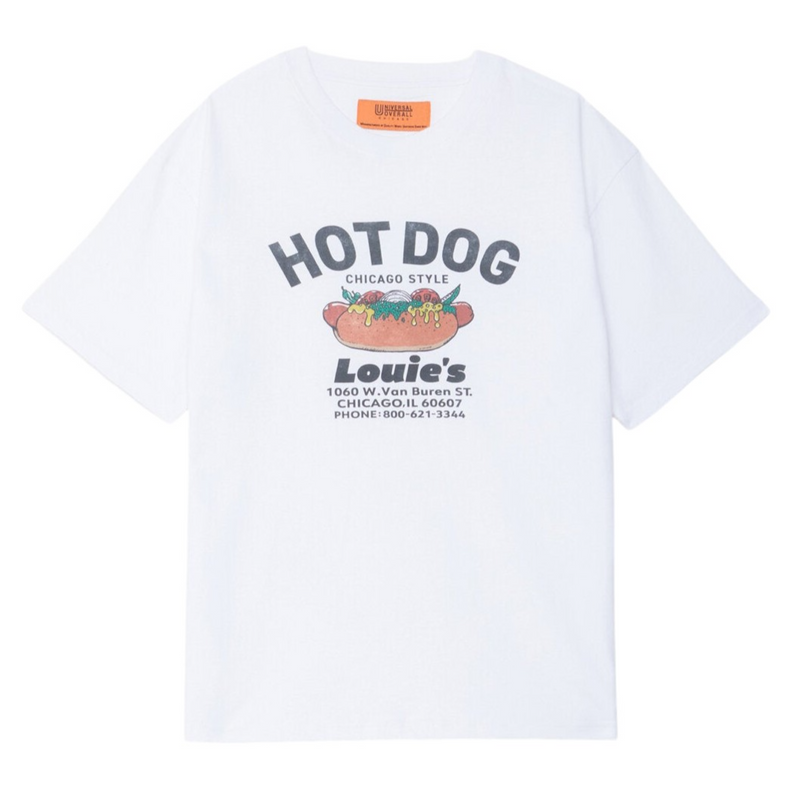 La t-shirt Universal Overall Chicago unisce l’autenticità del workwear americano a un’estetica streetwear contemporanea, distinguendosi per il suo carattere grafico deciso e riconoscibile. La stampa frontale, ispirata a un iconico chiosco di hot dog in stile Chicago, richiama il mondo del merchandising vintage e dona personalità a un capo essenziale.