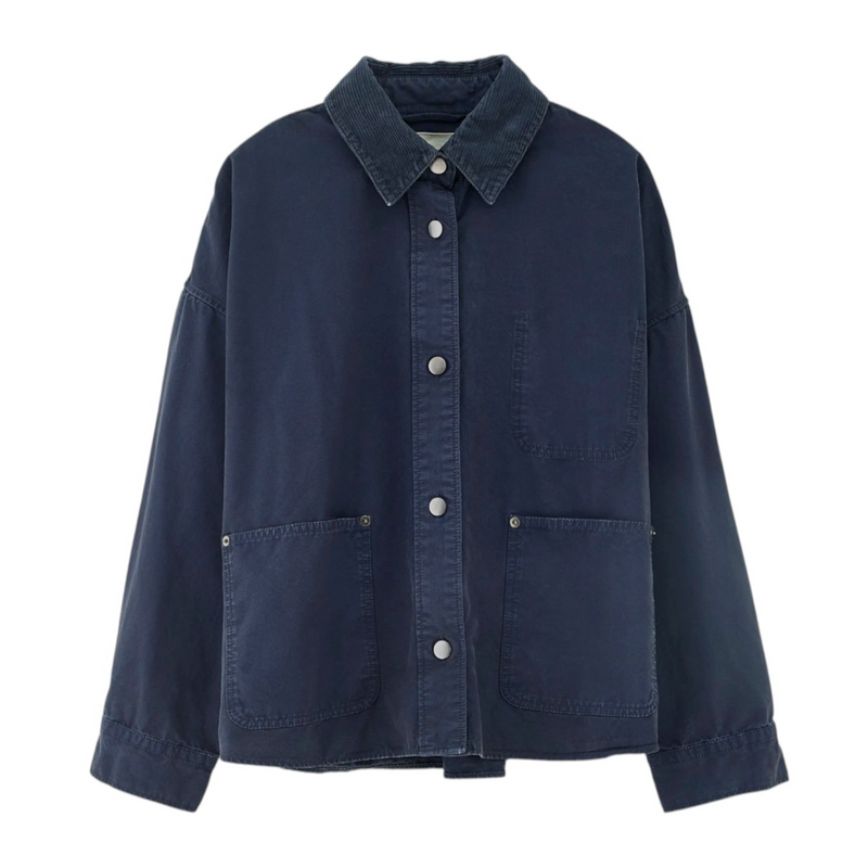 La vestibilità relaxed dona un aspetto moderno e disinvolto, con spalle leggermente scese e una linea confortevole che non limita i movimenti. Il design è essenziale ma curato, con colletto classico, chiusura frontale con bottoni e tasche applicate che richiamano un’estetica workwear reinterpretata in chiave contemporanea.